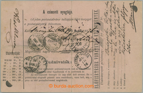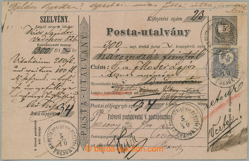 Philately. SLOVAKIA / whole post. p.stat dispatch-note with printed stamp5 Kreuzer, Mi.A9, for mailing of 300 golden from Bratislava to Budapest, uprated with stamp of the first issue Franz Joseph. 25 Kreuzer violet, Mi.13, posting