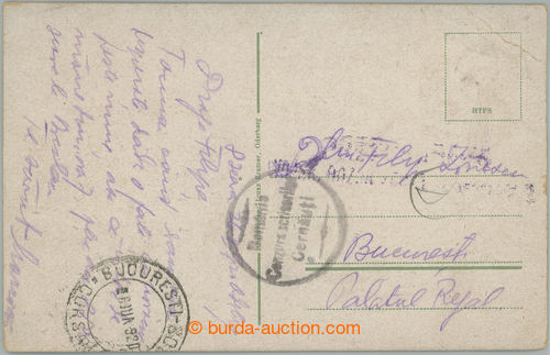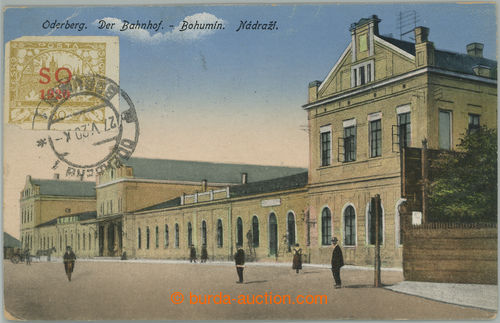 Philately. postcard railway-station in/at Bohumine, franked on front side by stamp. Hradcany 30h yellow, Pof.SO9, CDS BOHUMIN 1/ 27.V.20, to Rumania, cancel. Romanian censorship and arrival BUCHAREST 6.JUN.920; overall good