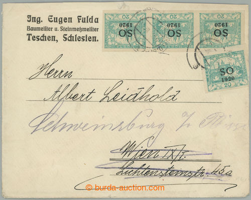 Philately. commercial heavier letter addressed to to Austria in III. postal rate, redirected, postal-charge 80h paid 4 pcs of stmp with overprint Hradcany 20h, Pof.SO6, posting nationalized CDS PETRVALD SLEZ. 28.VII.20, (incomplete