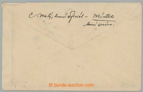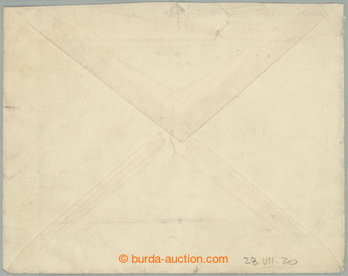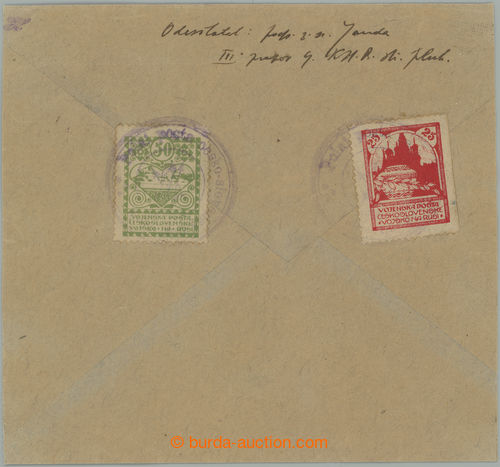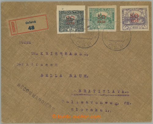 Philately. philatelically influenced Reg letter sent from Orlova to Bratislava, prefrankovany 3 pcs of stmp with overprint Hradcany, 120h, 200h and 400h, Pof.SO21, SO20, SO18, CDS ORLOVA 18.VIII.20; light folds in envelope (Image) (Image2)