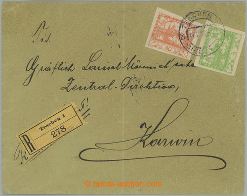 Philately. TESCHEN SILESIA / Reg letter with Hradcany 40h + 5h in time occupation Polish territory, CDS TESCHEN 1/ 19.II.19, Austrian Reg label Teschen 1, addressed to to Karvina; only fold, rare franking from period of sporu