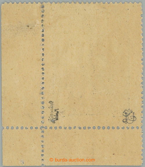 Philately. Pof.SO25, T. G. Masaryk 1000h brown, LR corner (!) piece, plate variety overprint - cut letter O on pos. 100, thin/light print overprint; minor gum fault, exp. Vrba, Karasek, Leseticky (Image) (Image2)