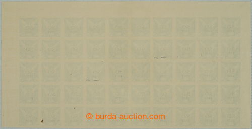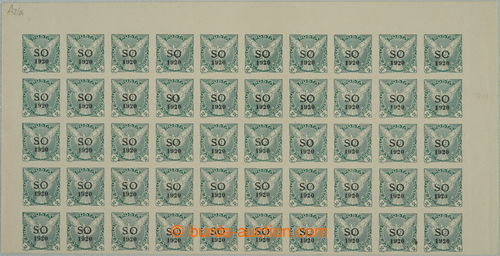Philately. COUNTER SHEET / Pof.SO28, Newspaper stamps - Falcon in Flight (issue) 2h green, upper 1/2 sheet, blk-of-50, 2x plate variety - thin O and other overprint defects, over-printing plate A/2; mint never hinged without folds,
