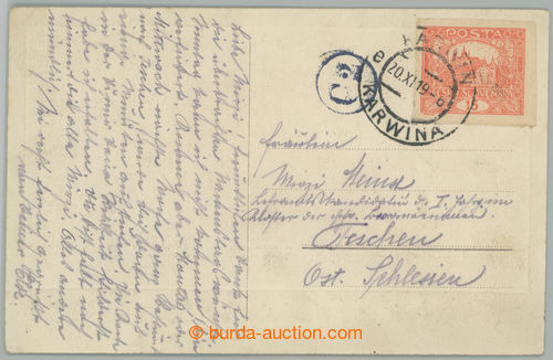 Philately. TESCHEN SILESIA / advertising postcard (Kathreiners Malzkaffee) sent from Karvina to Tesin, with Hradcany 15h bricky red, CDS KARVIN 20.XI.19, supplemented with Polish censorship cancel. C2; good condition (Image) (Image2)