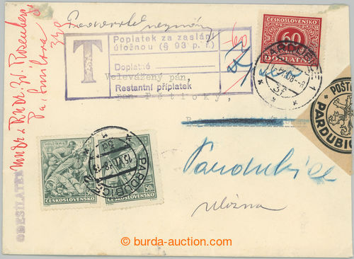 Philately. DEAD LETTER OFF. PARDUBICE / letter with mailing CDS PARDUBICE 2/ 15.VI.38, to ROSICE N. L. 16.VI.38 and as undeliverable predany dead letter off. for ascertainment of sender, then mounted Postage due stmp stamp. 60h
