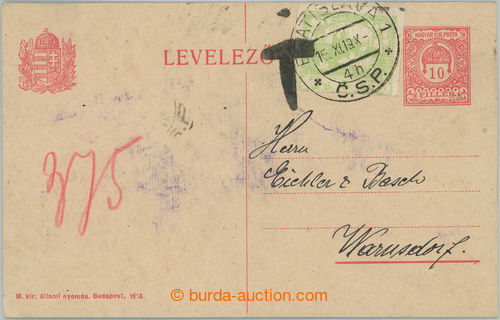 Philately. CPR36, Hungarian PC 10f red, uprated with stamp Hradcany 5h, CDS BRATISLAVA 1/ 15.XI.19, sent after/around termination validity, marked T, avsak excess postage unwithdrawn; good condition, interesting (Image) (Image2)