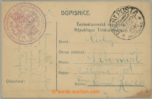 Philately. RUSSIA / card addressed to Czechoslovakia, with print of large circular cancel. CS. REPUBLIKA/ MINISTERSTVO VOJENSTVI ODD. V RUSKU/ VOJENSKA SPRAVA in violet color, supplemented with black round FP-postmark., POSTE