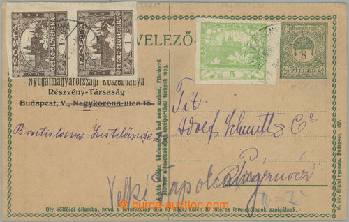 Philately. CPR30, Mi.P61, parallel Hungarian PC 8f uprated with stamp Hradcany 2x 1h and 5h for II. postal rate, with slepou perf for typewriter in upper margin, on both sides private additional-printing f. NYUGAT MAGYARORSZAGI