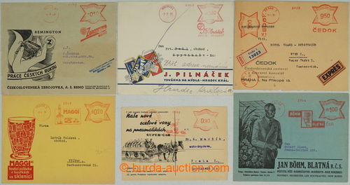 Philately. comp. 6 pcs of entires with decorative advertising added prints, franked/paid print pay machine, MAGGI, MELICHAR BRANDYS N. L., ZBROJOVKA, PILNACEK, BOHM BLATNA, CEDOK, 1x sent as Reg and Express with two print meter