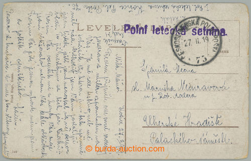 Philately. VZNIK CZECHOSL. LETECTVA / FIELD AIRCRAFT TROOP, violet military unit postmarks on Ppc Kosice, CDS CZECHOSL. FP 75/ 27.II.19, sender L. Rehak, I. field aircraft troop Kosice; lower tearing, else preserved, sought (Image) (Image2)