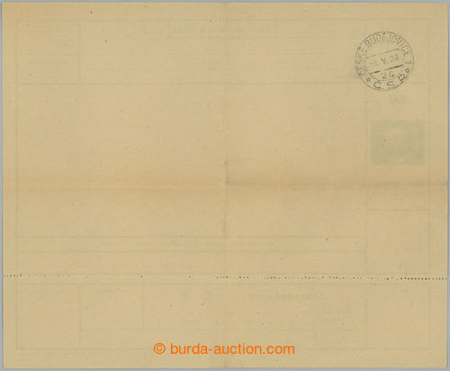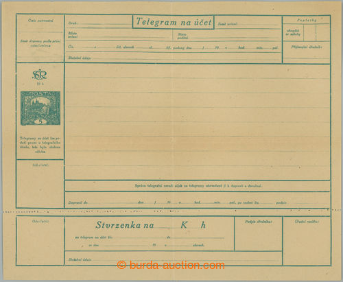 Philately. CTU1A Pa, Telegram on/for bill Hradcany 5h green, yellow-brown paper, Czech text, complete incl. confirmation, on reverse imprint of daily postmark CESKE BUDeJOVICE 1/ 8.V.20; cross fold, c.v.. 3.900CZK (Image) (Image2)