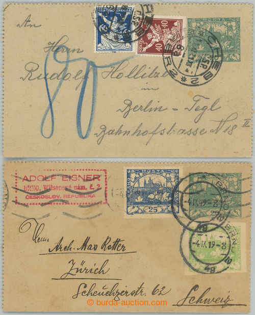 Philately. CZL1, Hradcany 20h green, comp. 2 pcs of letter cards addressed abroad, 1x to Switzerland uprated with stamp Hradcany 25h blue + 5h light green with CDS BRNO 2/ 4.IX.19, 1x to Germany, uprated with stamp issue