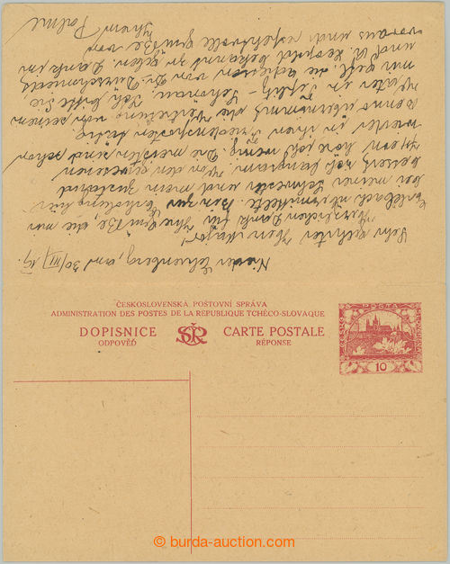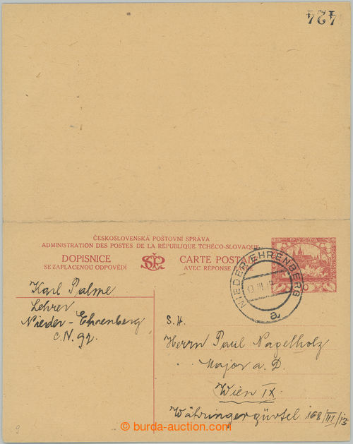 Philately. CDV9, Hradcany 10h+10h, whole double PC abroad to Wien (Vienna), CDS NIEDER EHRENBERG (bottom Krecany) 30.III.19, answer part nepouzita; very nice good condition (Image) (Image2)
