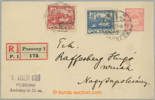 Philately. CPR37, Hungarian parallel postal stationery cover 10f, size 150x95mm sent as Reg to Topolcan on/for end postal rate I, uprated with stamp Hradcany 25h blue and 10h red, CDS POZSONY 919 Maj.12., on reverse arrival