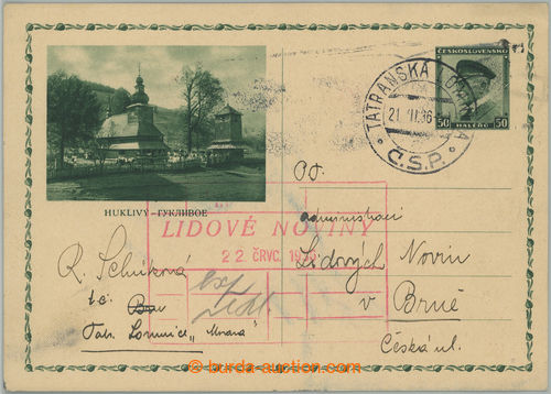 Philately. CDV61/13, Huklivy, issue Pictorial PC 1936, Us, CDS TATRANSKA LOMNICA 21.VII.36, evidence postmark People's newspaper; good condition
