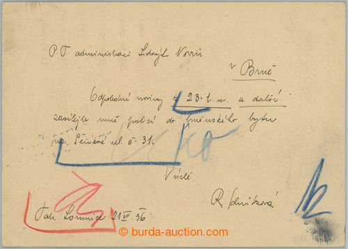 Philately. CPV3A, order card Hradcany 20h red with emblem, Czech text; only partially povolena perf, slightly toned in margins (Image) (Image2)