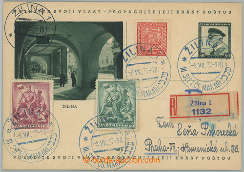Philately. CDV69/218, Zilina, issue Know Your Country, uprated with stamp Zboriv 1CZK and 50h and coil- stamp. Coat of arms 20h, sent as R+Tiskopis, posting blue special postmark ZILINA/ SJEZD CZECHOSL. MACCABI 8.VII.37,