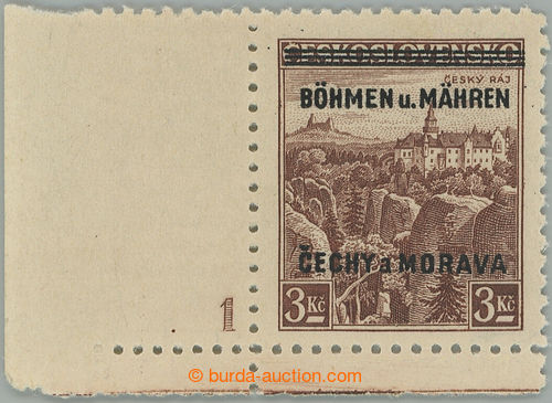 Philately. Pof.16 plate number, Bohemian Paradise 3CZK, L the bottom corner stamp. with plate number 1, close margin and registry point; mint never hinged, exp. by Mrnak., Gilbert (Image) (Image2)