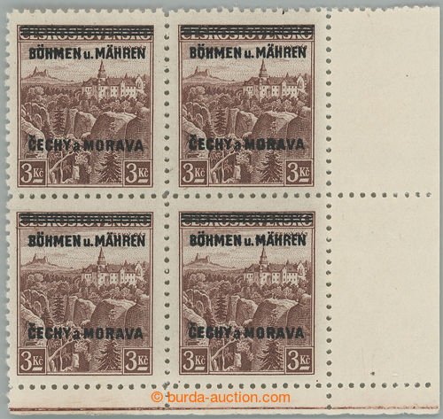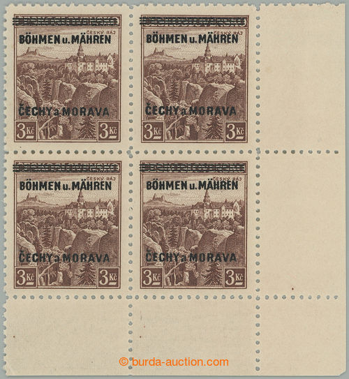 Philately. Pof.16 over-printing plate, Bohemian Paradise 3CZK, LR corner blk-of-4, wide margin and registry point; mint never hinged, sought