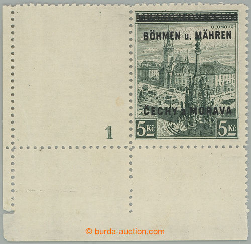 Philately. Pof.K18 plate number, Olomouc 5CZK, L the bottom corner piece with coupon with plate number 1 and without registry point; mint never hinged, minor faults, exp. by Gilbert (Image) (Image2)