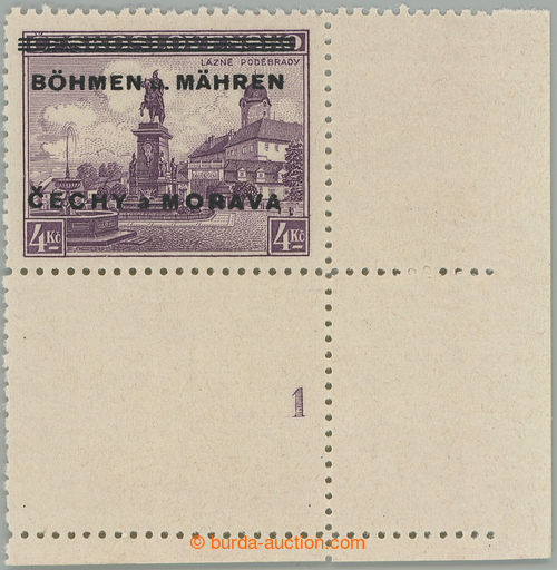 Philately. Pof.K17 plate number, Podebrady 4CZK, right the bottom corner stamp. with coupon and with plate number 1; mint never hinged