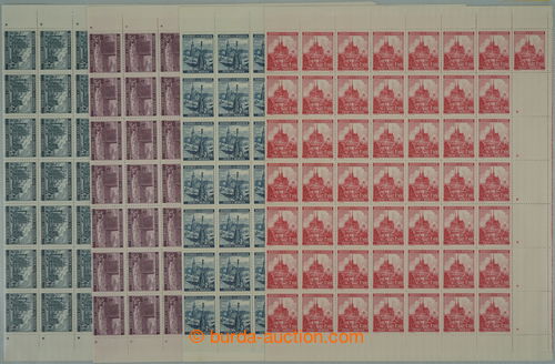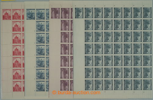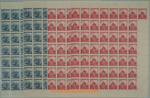 Philately. COUNTER SHEET / Pof.33+35, Landscape the first issue., Brno 1,50 Koruna + Olomouc 2,50 Koruna, comp. of 4 complete sheets of 100, always plate mark * and +; vert. fold, several times slightly povolena perf, 2,50 Koruna