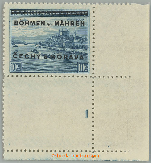 Philately. Pof.K19 plate number, Bratislava 10CZK, LR corner piece with coupon with plate number 1 and with register point; mint never hinged, exp. by Gilbert (Image) (Image2)