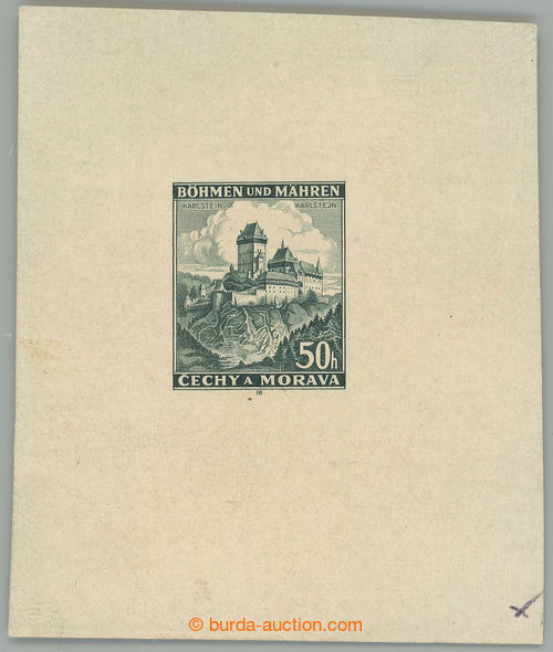 Philately. PLATE PROOF Pof.29, Karlstejn (castle) 50h, print dohotovene gravure refused arrangement (different size lower inscription) in/at definitive green color on/for pokridovanem card paper without gum; superb without marks,