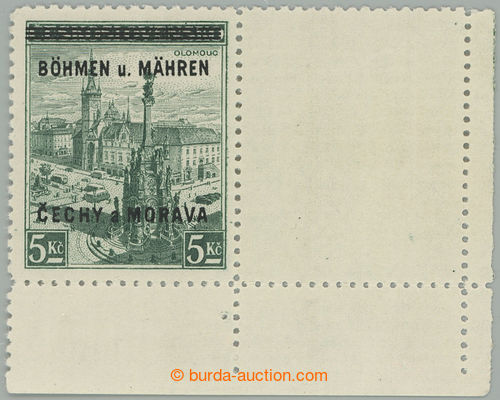 Philately. Pof.18KP, Olomouc 5CZK, LR corner piece with coupon and margin; mint never hinged, small grain in paper, exp. by Gilbert