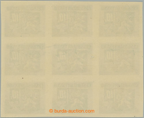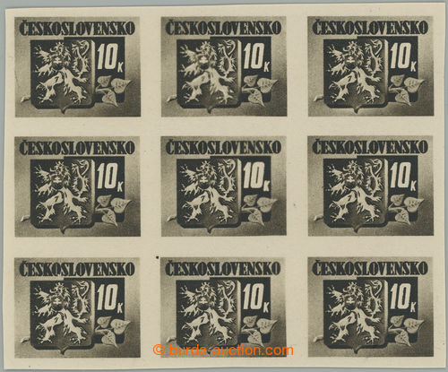 Philately. Pof.371 ST, Bratislava's 10K black, blk-of-9, in the middle with joined type close 0 on pos. 26 + above her plate variety 16 - rozlity cross in emblem; mint never hinged (Image) (Image2)