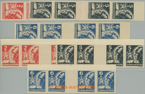 Philately. MEZIARSI / Pof.354-356Mv(4) and Ms(4), 2K-6K, complete set vertical and horiz. 4-stamp gutter., horiz. 5 Koruna shade grey-black, all horiz. with upper margin; sporadically minor gum fault (print fingers), otherwise very