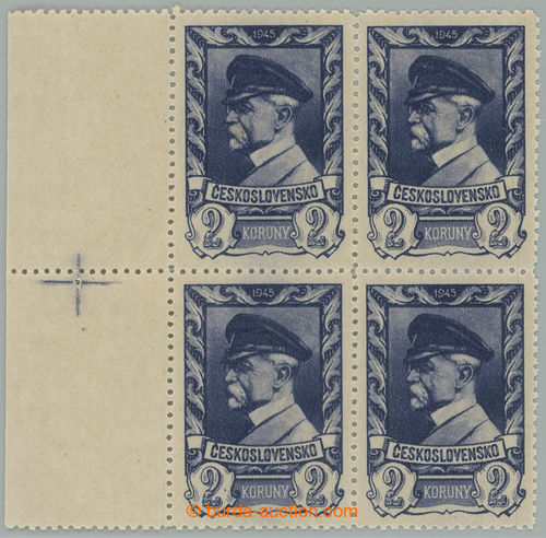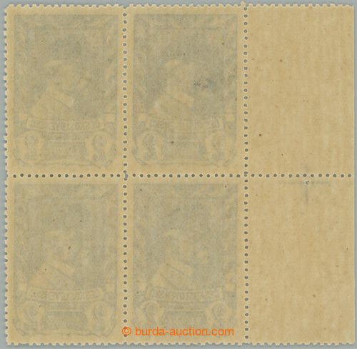 Philately. Pof.386, Moscow 2 Koruna grey-blue, L marginal block-of-4 with registry cross from plate 2; mint never hinged, very rare plate, missing in most collections! (Image) (Image2)