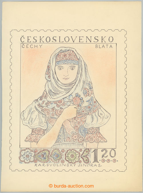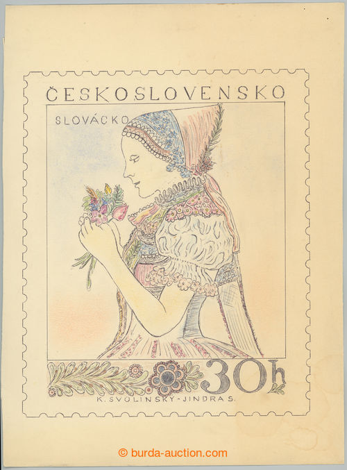 Philately. DESIGNES / selection of two colored designes (drawings) for stamps Pof.913 and 914, Costumes (II) 30h and 1,20Kcs; without signature, interesting (Image) (Image2)