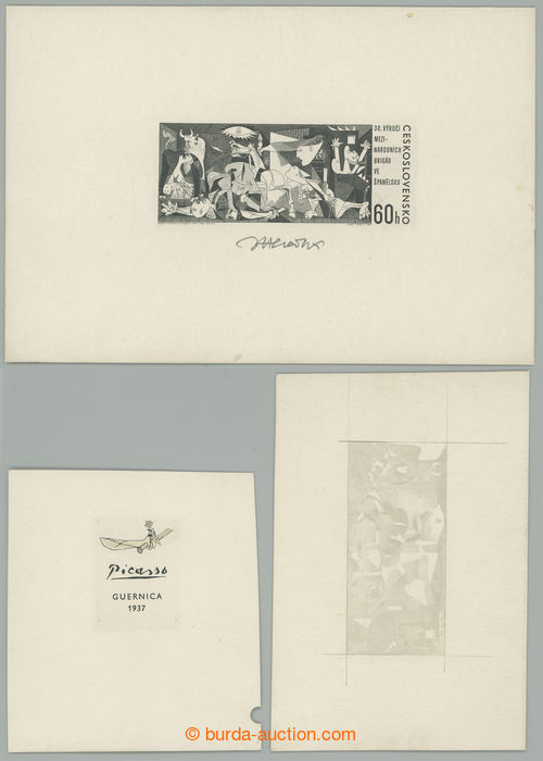 Philately. PLATE PROOF Pof.1543, 30. Anniv Interbrigad in Spanelsku (Guernica) 60h, comp. 3 pcs of plate proofs in black color on/for strong cardboard paper without lepu: 1x almost definitive stmp (missing wedge [ ˇ ] above C)