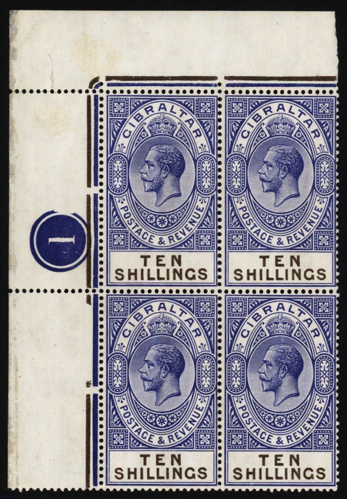 1925-32 Colours Changed 10s deep ultramarine & black upper left corner marginal Plate block of four, UM (gum toned), SG.106. (4)