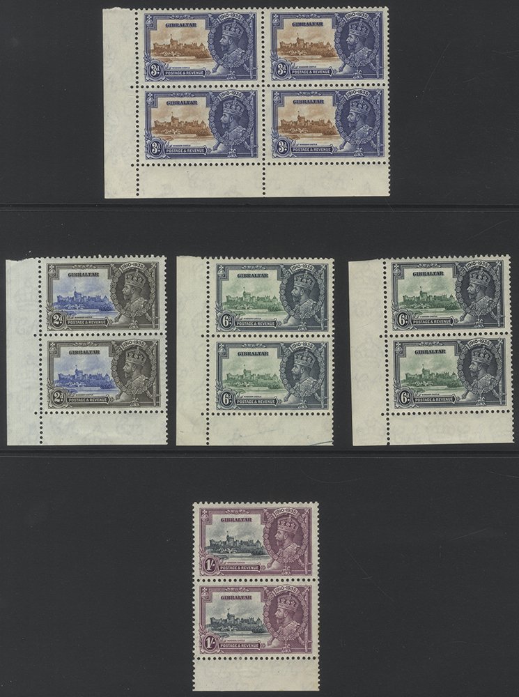 1935 Silver Jubilee with 'extra flagstaff' variety on 2d, 6d & 1s vertical marginal pairs, also 3d marginal block of four (each incl. the variety), plus another 6d pair without variety, SG.114/117, 114a/117a. (12) Cat.