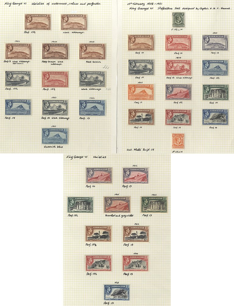 1938-51 KGVI Defins M range on leaves of the various perf & wmk variations incl. 2d P.13½ wmk sideways, SG.124ab (Cat. £800) incl. high vals 5s (3), 10s (2) & £1. (36) Cat. £2200 (Image)