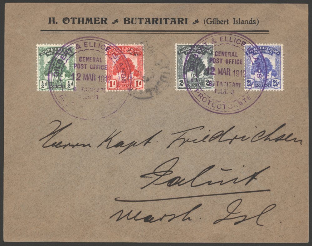 1912 cover bearing the 1911 set of four cancelled 'General P.O/12.Mar.1912/Butaritari Island' large double ring d/stamps to Marshall Island. (Image)