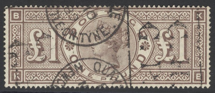1888 Wmk Orbs £1 brown lilac, Quayside/Newcastle on Tyne c.d.s & boxed accountancy cancels, good to fine. (1) SG.186, Cat. £4500.