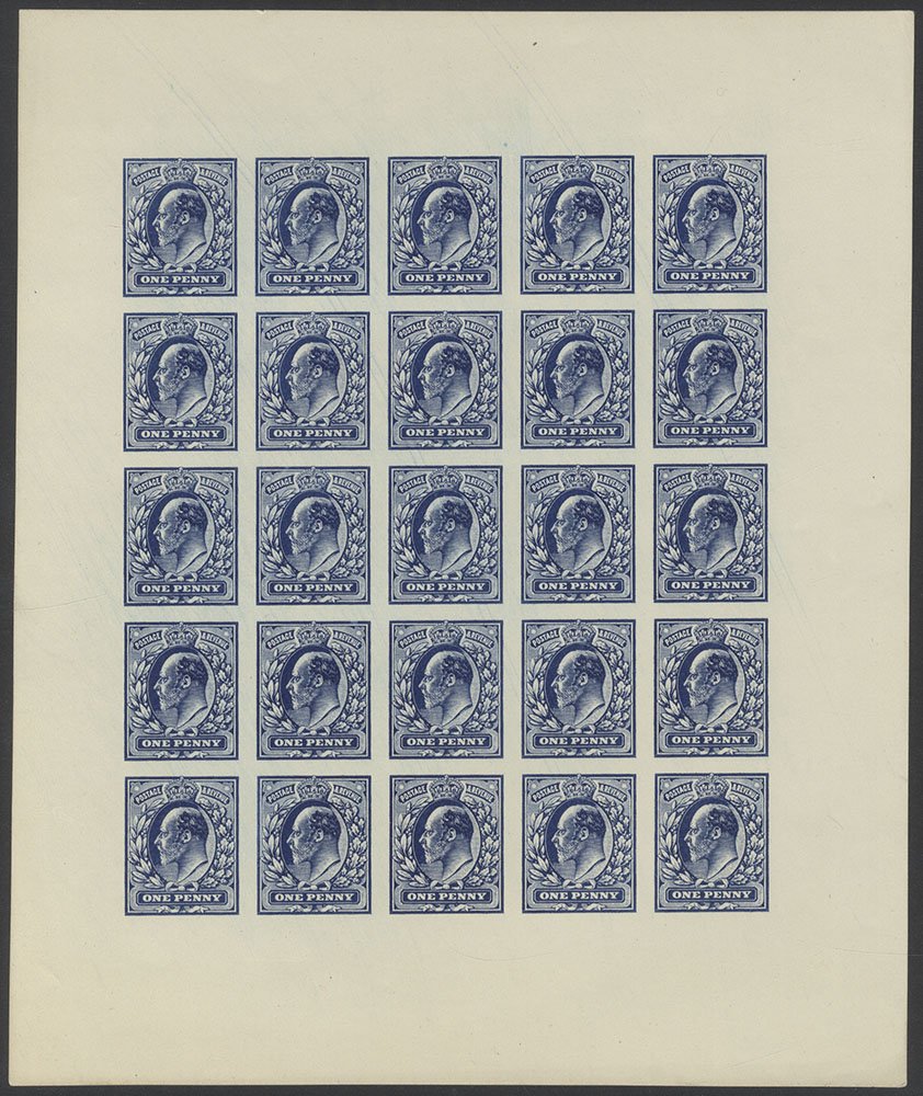 1902 1d blue 'ECKERLIN' Proofs c1920. A complete sheet of 25 on ungummed paper. Produced in Germany to promote Dr. Eckerlins Rotary Press for Intaglio printing. (Image)