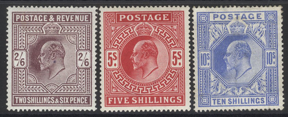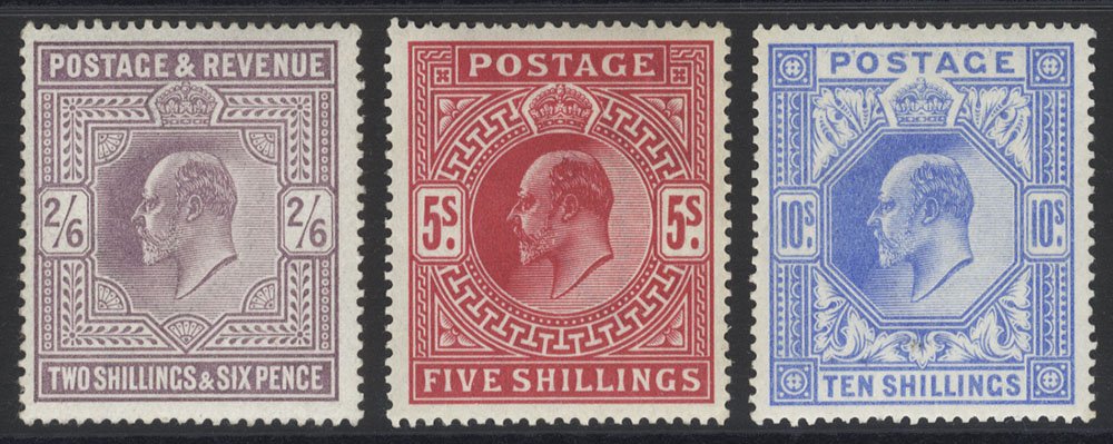 1902-10 DLR 2/6d, 5s & 10s, on ordinary paper, all M (10s looks UM), SG.260, 264, 265. (3) Cat. £1550. (Image)
