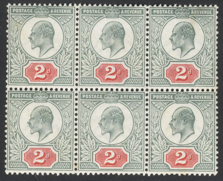 1902 2d pale grey green & carmine red, UM block of six (3 stamps creased), SG.227. (Image)