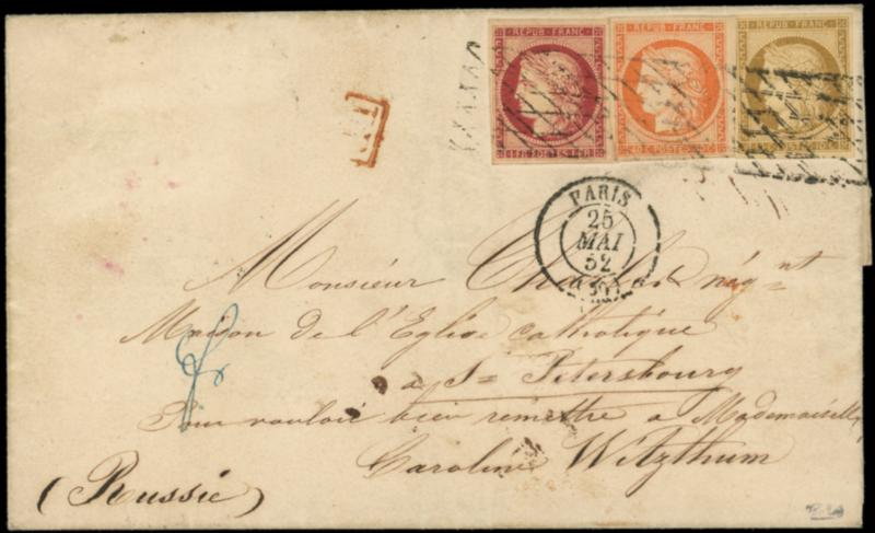 1,5 et 6, 10c., 40c. et 1f. obl. GRILLE SANS FIN s. LSC, càd Paris 25/5/52, passage BERLIN 27/5 et arr. St PETERSBOURG 21/5 julien, combinaison TRICOLORE Superbe....