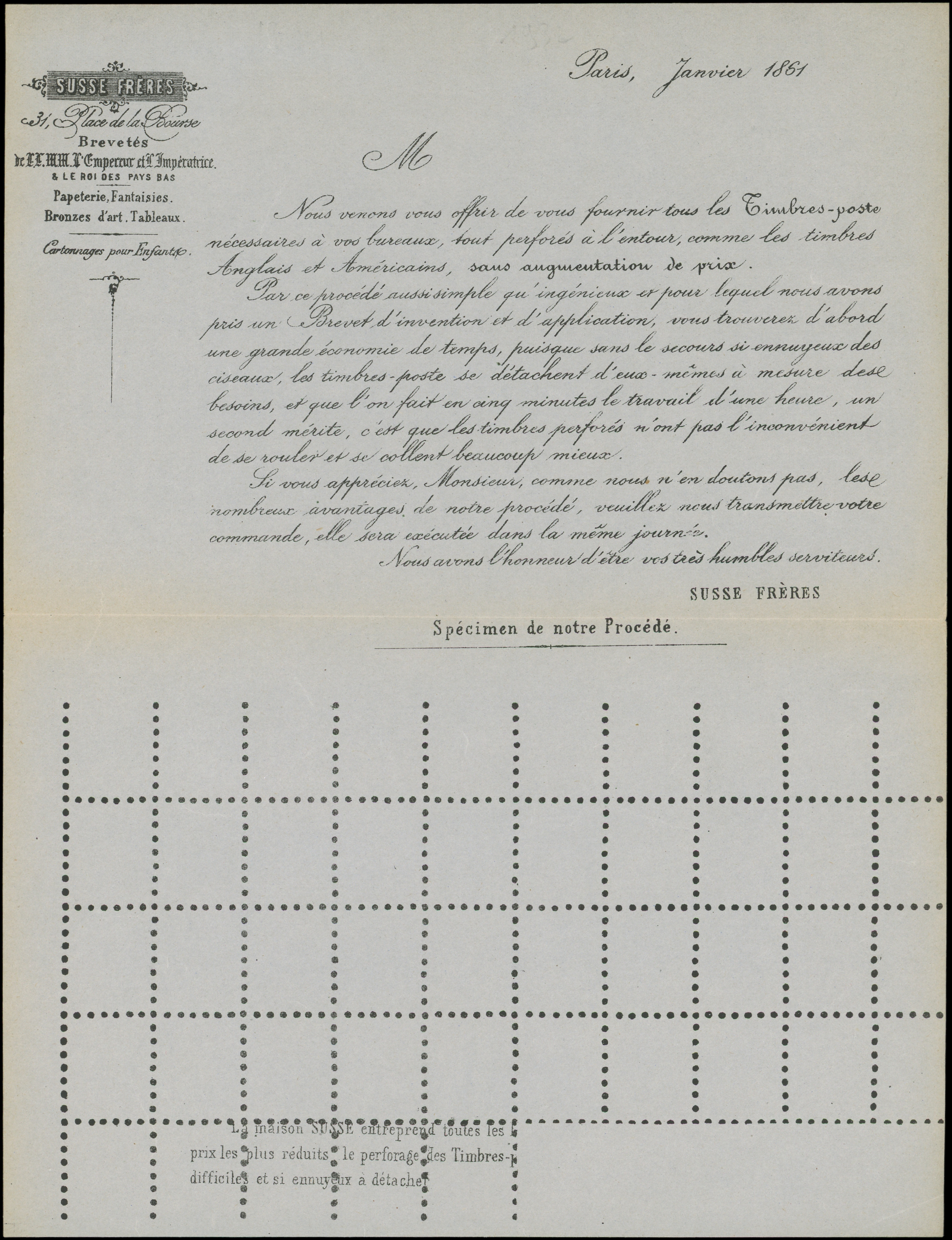 1/1861 à entête Susse Frères Place de la Bourse expliquant leur procédé avec Specimen inclus, RR, TB (Image)