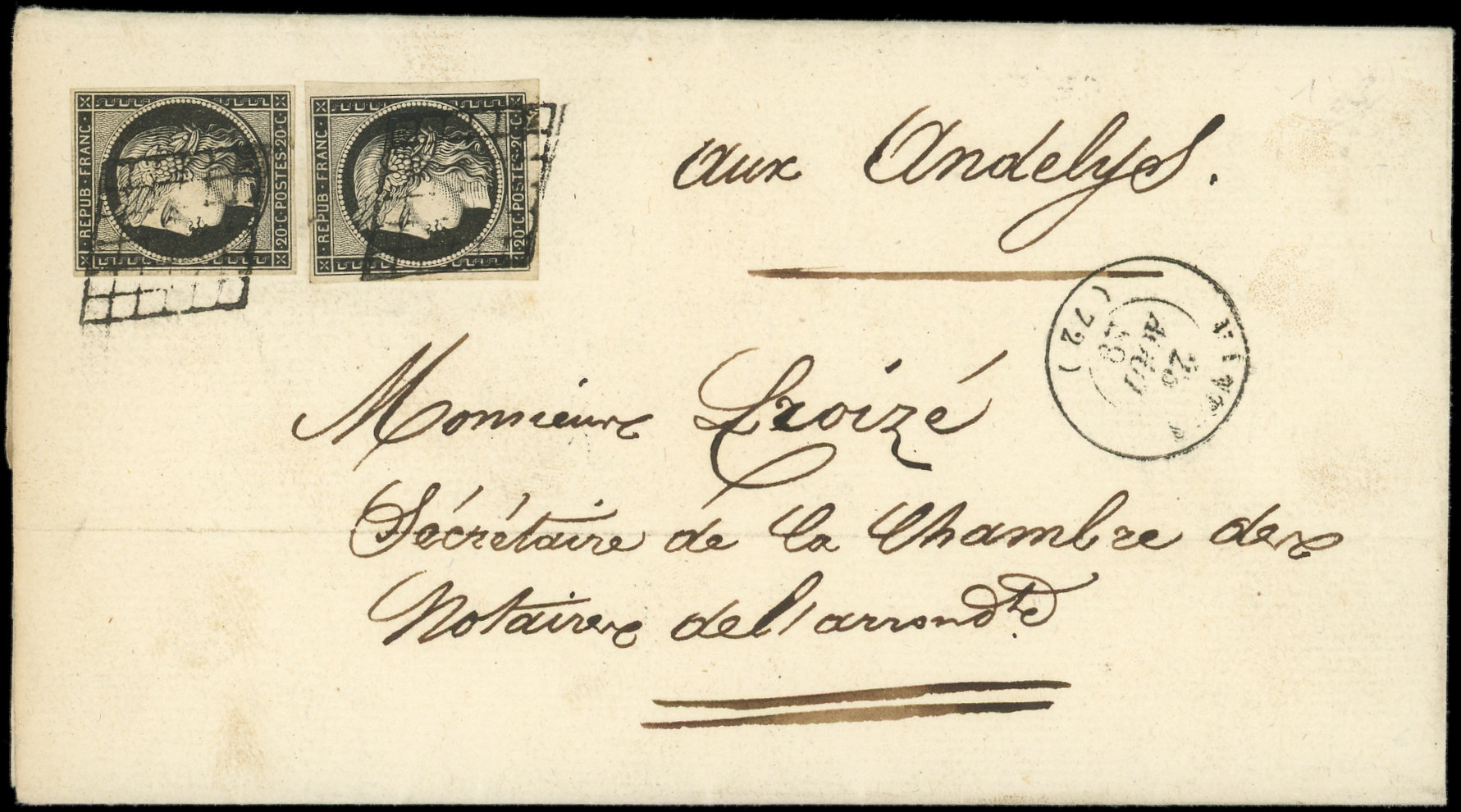 blanc, 2 ex. obl. GRILLE s. LAC, càd T15 MANTES 23/8/49, TTB (Image)