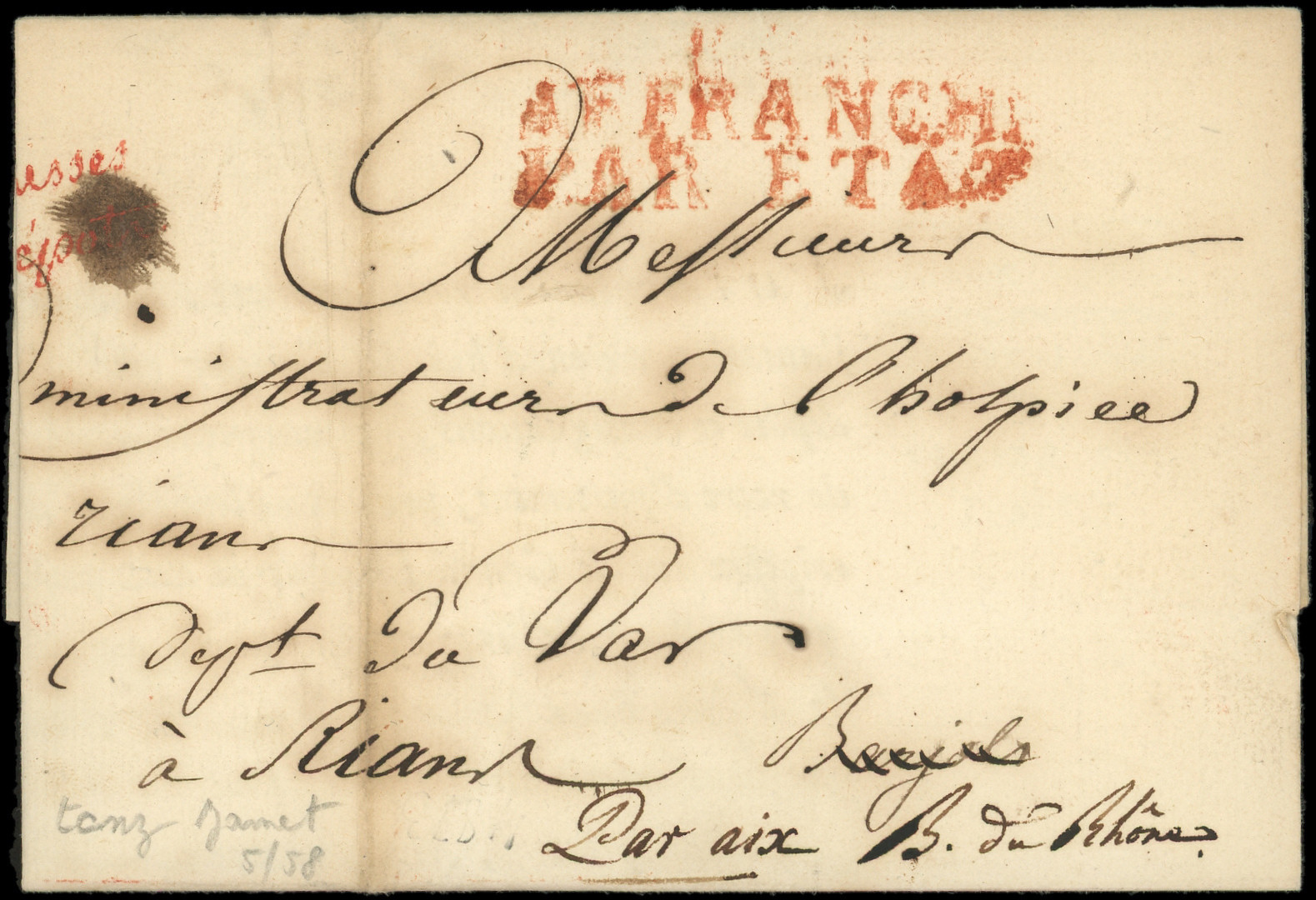 DEB.78/BARJOLS sur LAC en Franchise de 1829, MP rouge AFFRANCH/PAR ETAT, Superbe (Image)