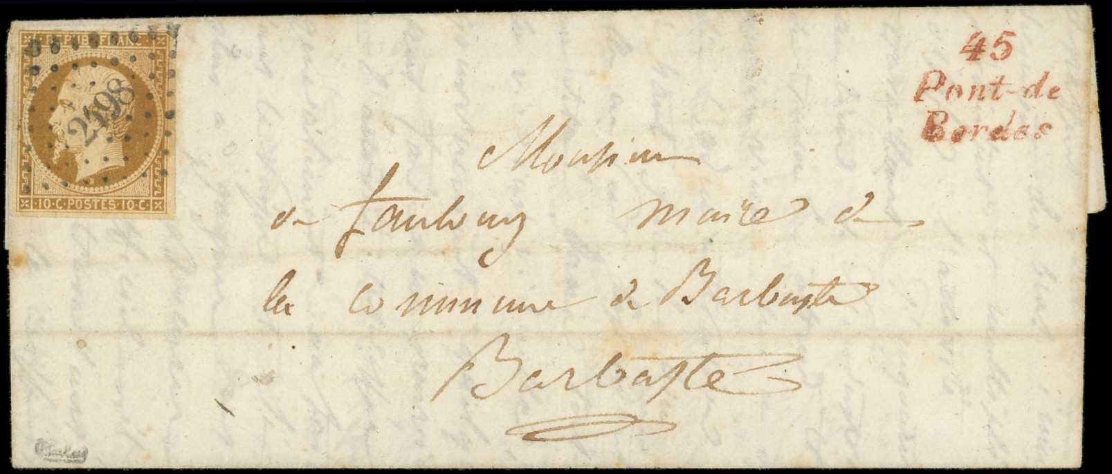bistre-jaune, obl. PC 2498 s. LAC du 17/12/52, Cursive 45/PONT-DE/BORDES en ROUGE, RR et Superbe (Image)