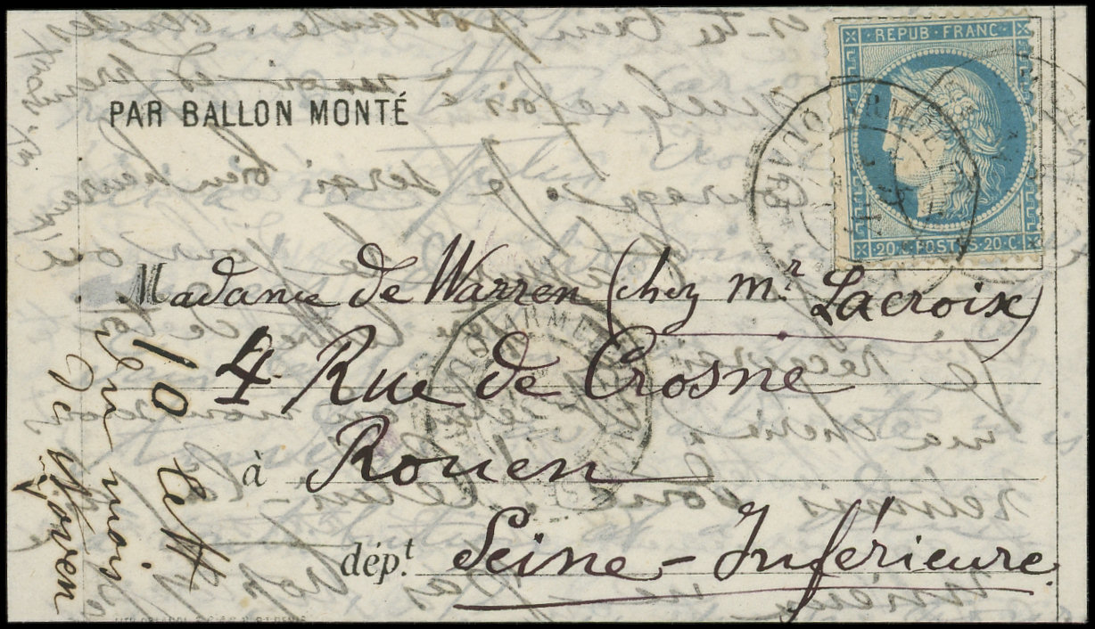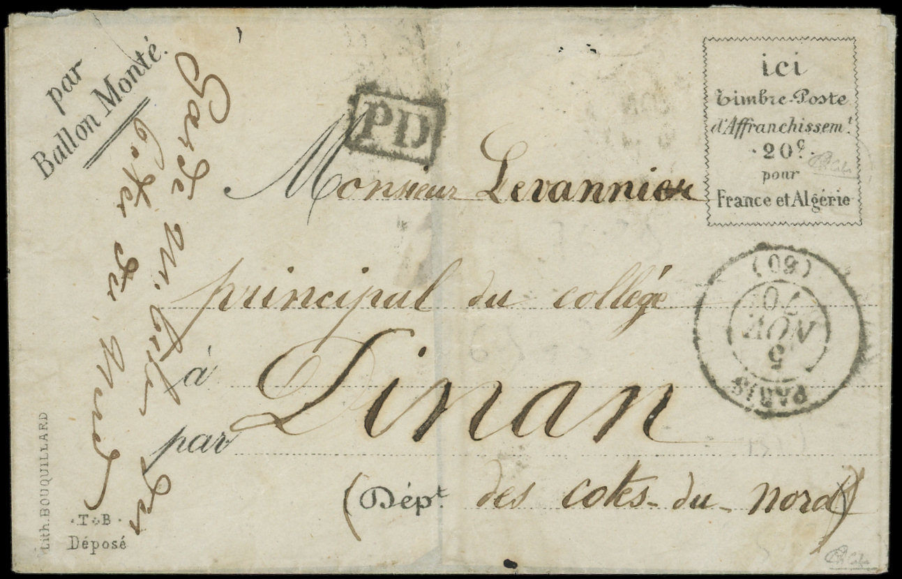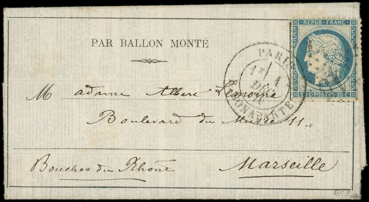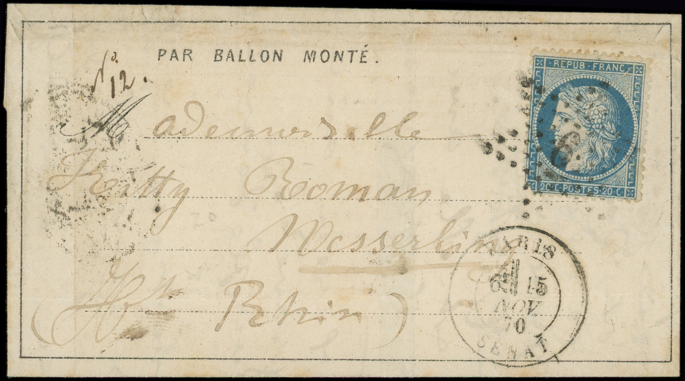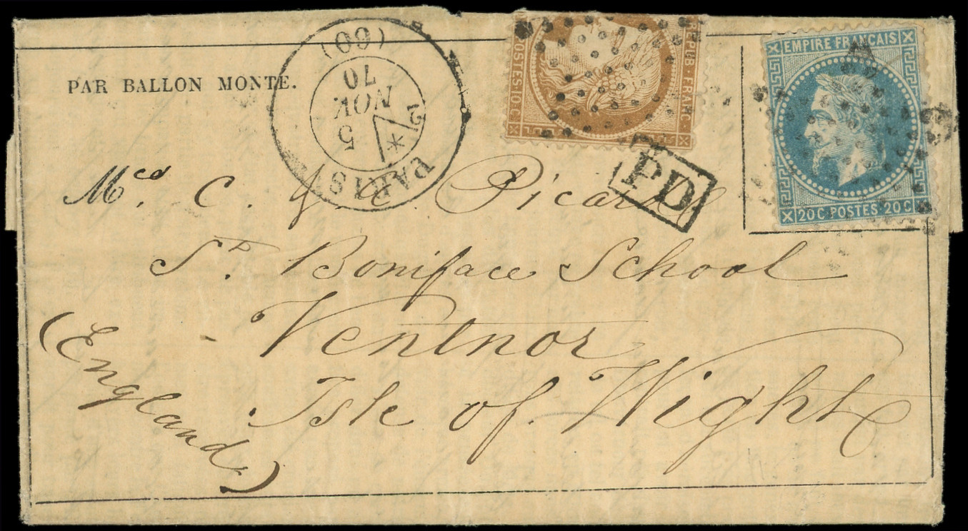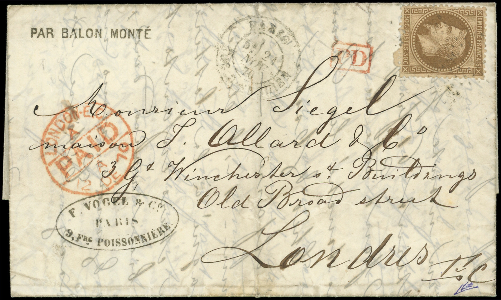 4 s. LAC Formule PAR BALON MONTE et cachet de l'expéditeur F. VOGEL, càd Rue d'Enghien 24/11/70, arr. LONDON 12/12, combinaison RR et TTB (Image)