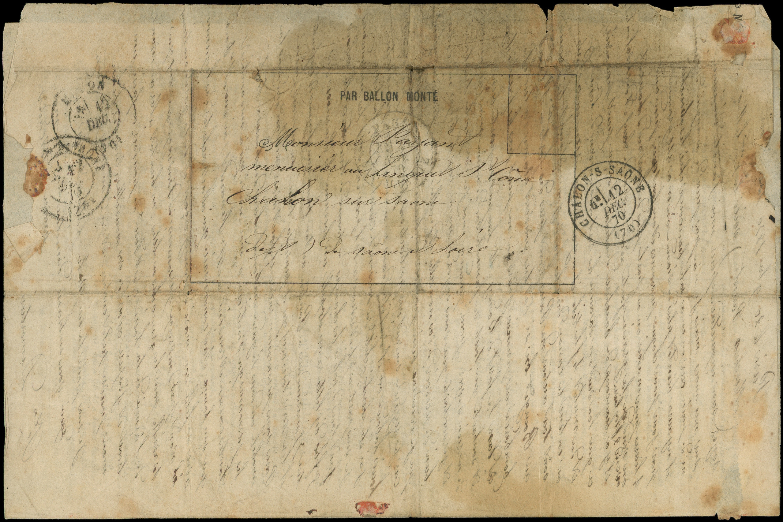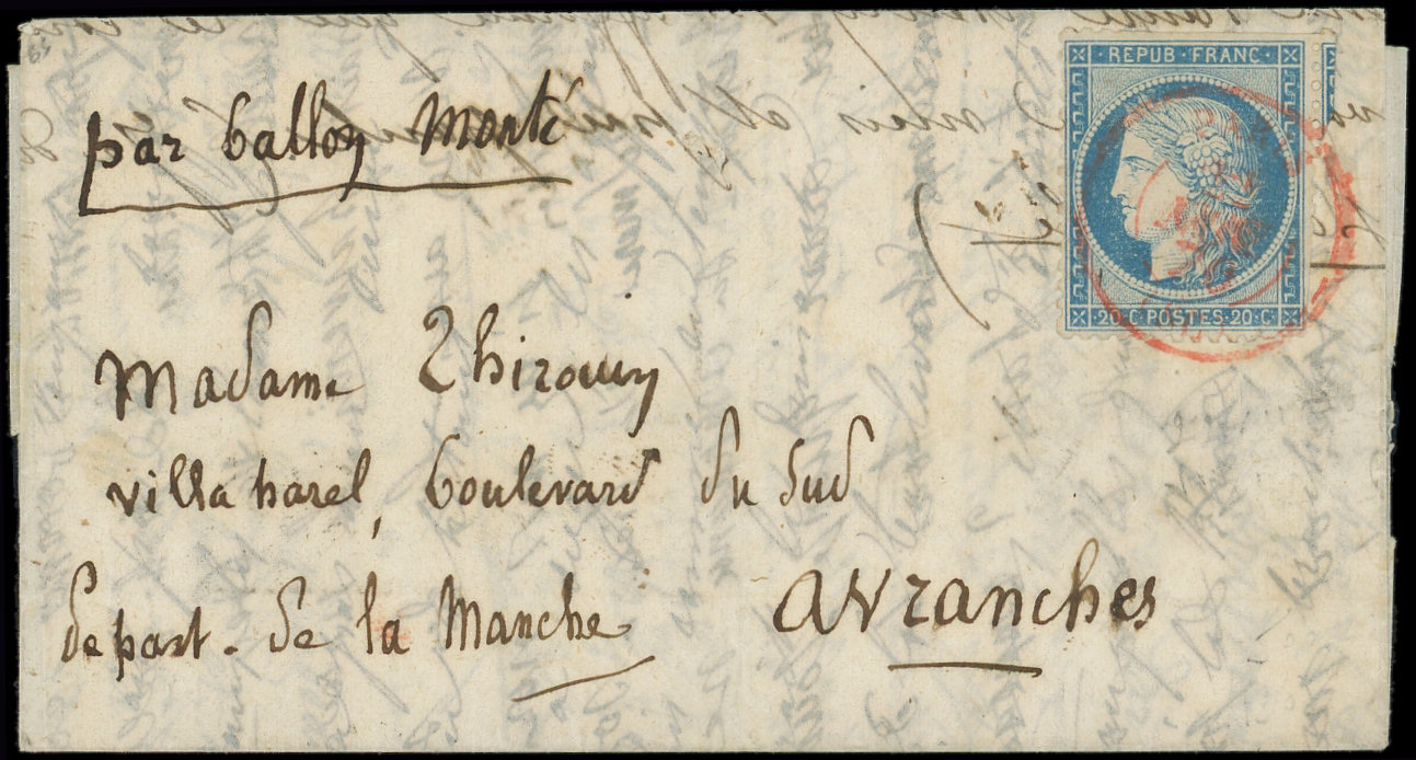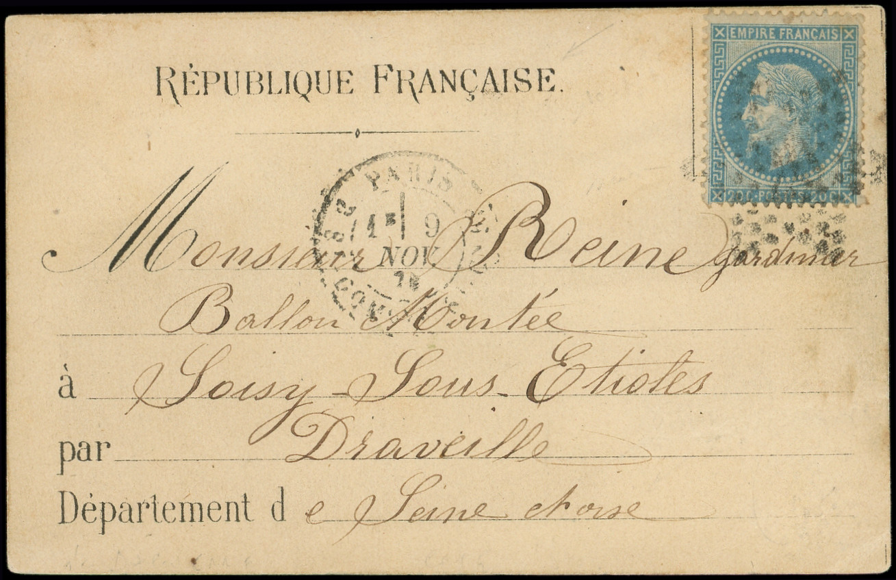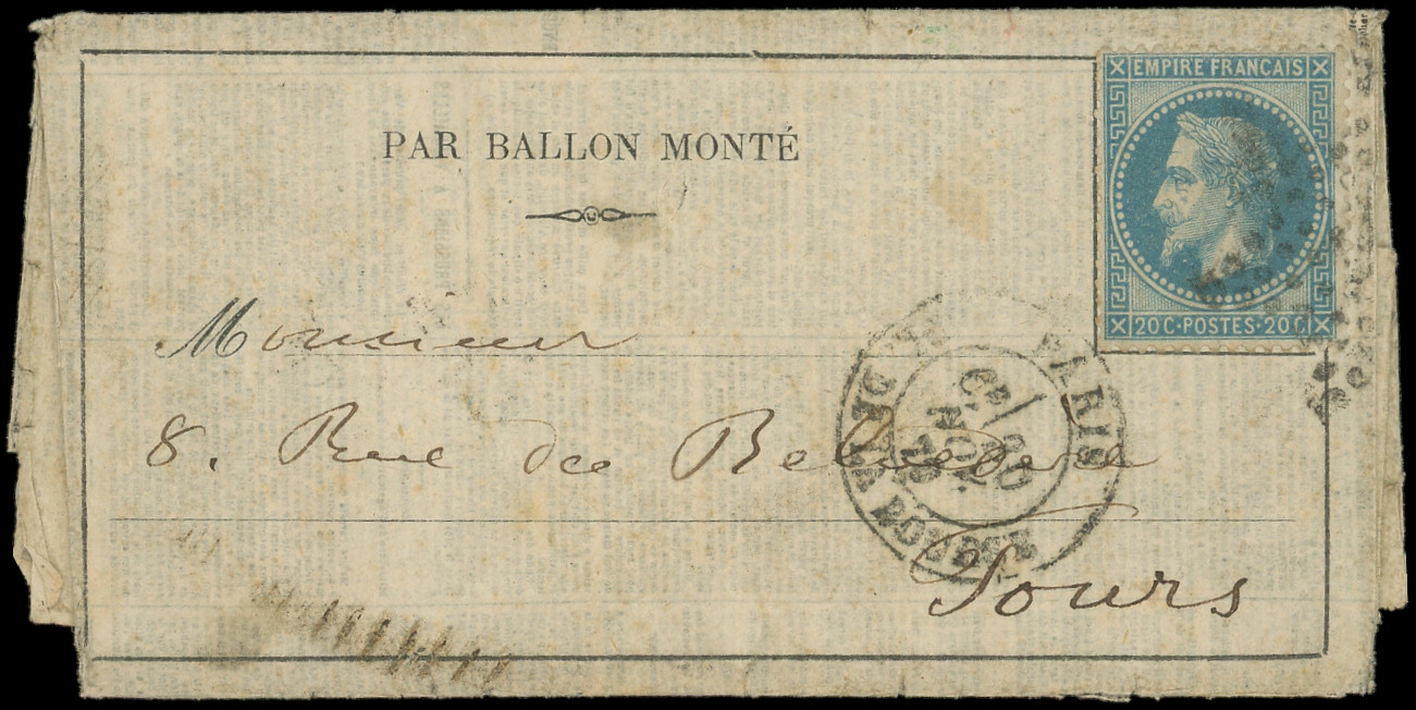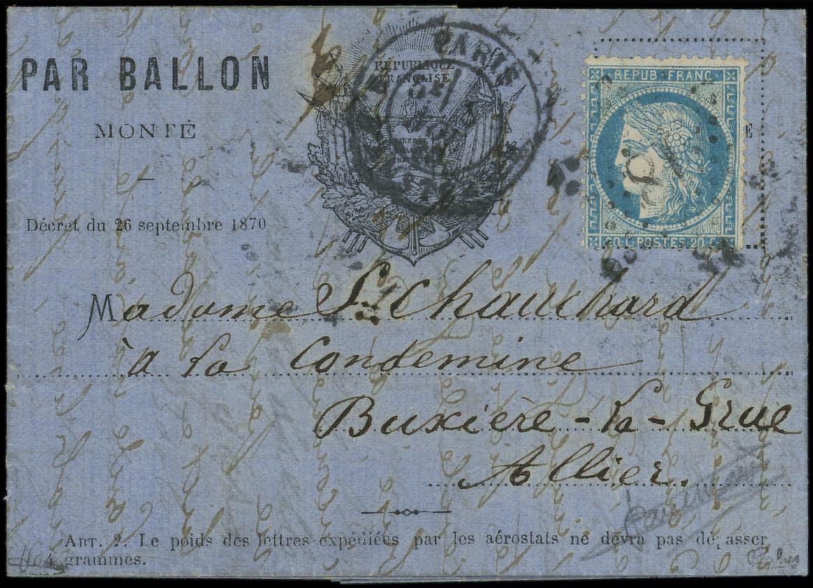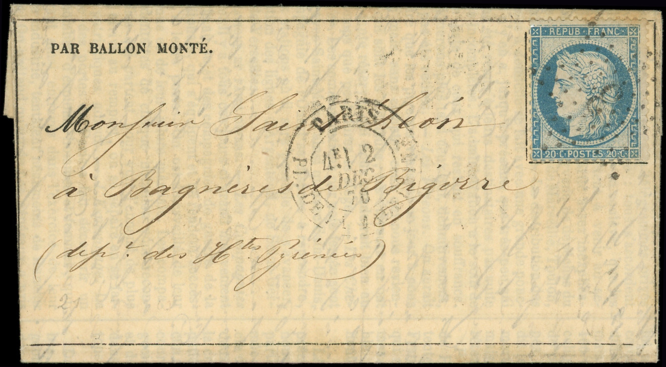 4 s. LAC Formule PAR BALON MONTE et cachet de l'expéditeur F. VOGEL, càd Rue d'Enghien 24/11/70, arr. LONDON 12/12, combinaison RR et TTB (Image)