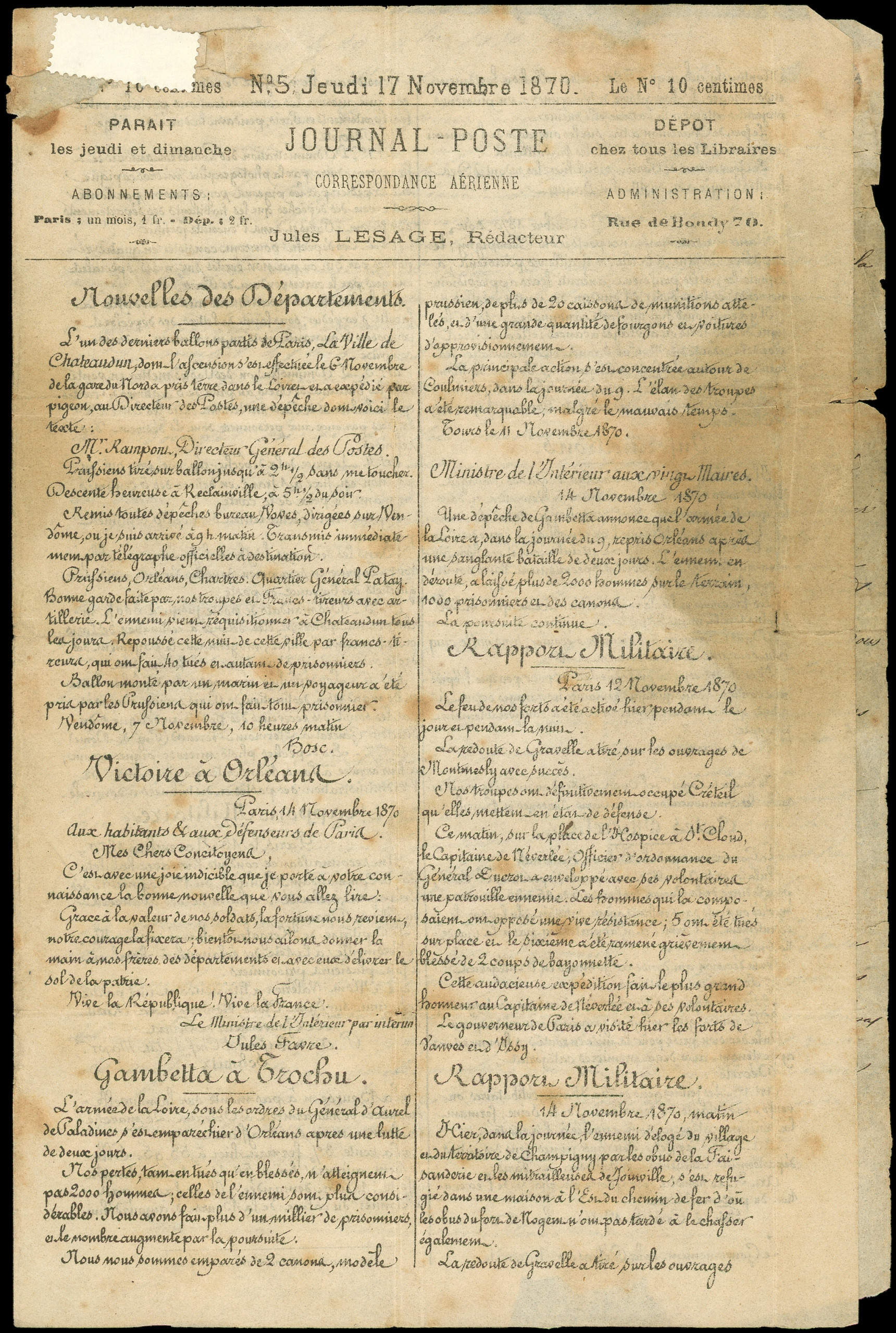 21/11/70, affranchissement disparu dans l'immersion s. JOURNAL POSTE N°5, passage MACON et arr. CHALON-S-SAONE 12/12, LA VILLE D'ORLEANS accidenté, B/TB (Image) (Image2)